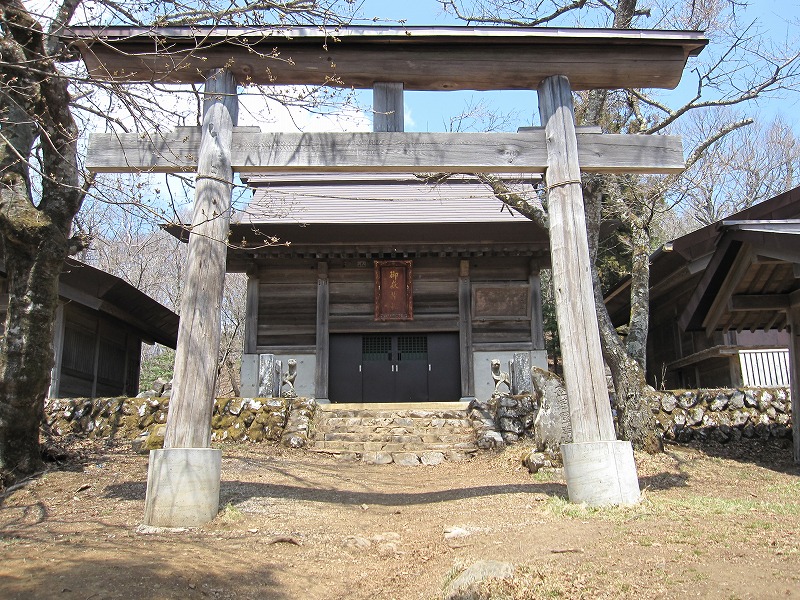 水場を過ぎると、ここから先は「武甲御嶽神社」の領地なるぞと石柱が建てられていました。この辺りからは砂利、ゴロゴロ石、杉の木の根、歩きにくい場所も多くなり、やがて一際大きな杉の木が現れます。大杉の広場です。山頂までの中間ぐらいのところで約1時間です。ほとんど一定勾配でジグザグに登って行くコースです。1時間ほど行くと、大きな社殿の屋根が見えてきました(ホッ)社殿は大きく立派な造りでした。工事も大変だっただろう(実感)